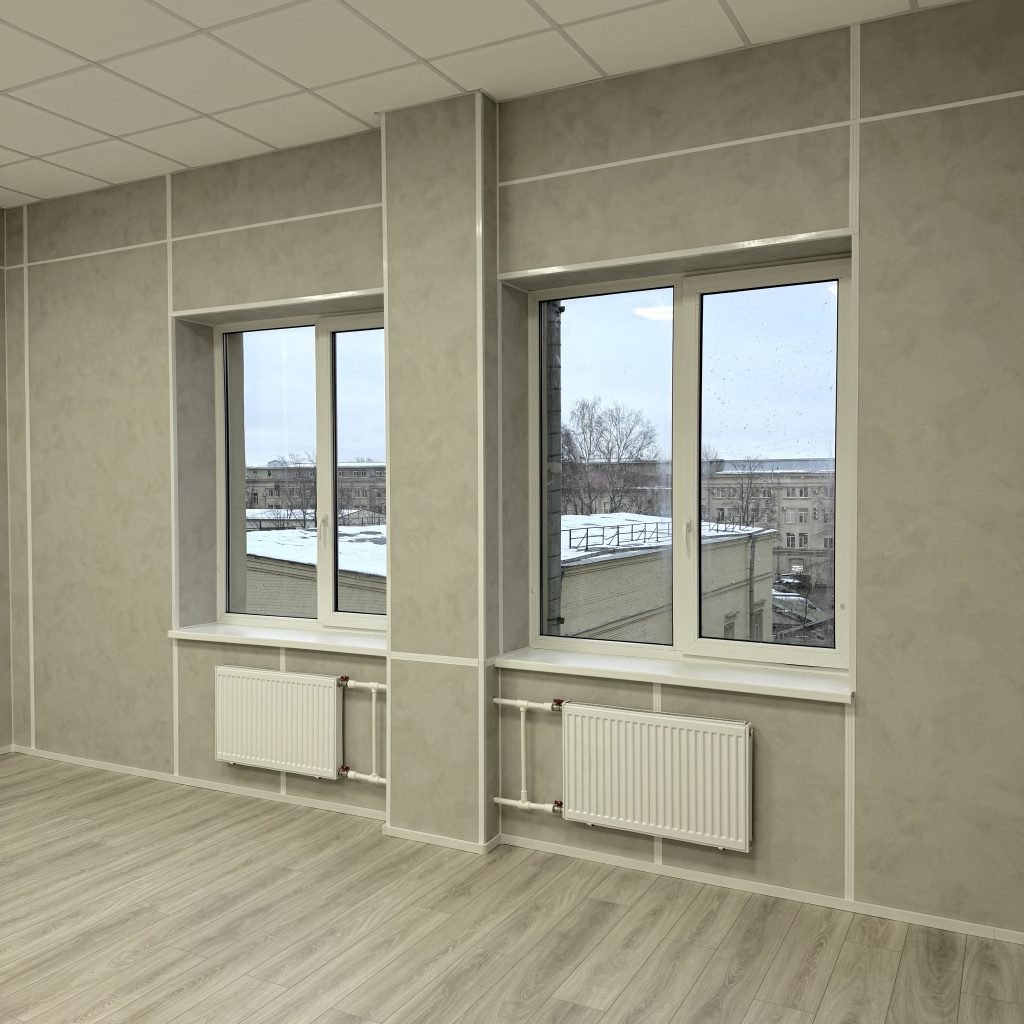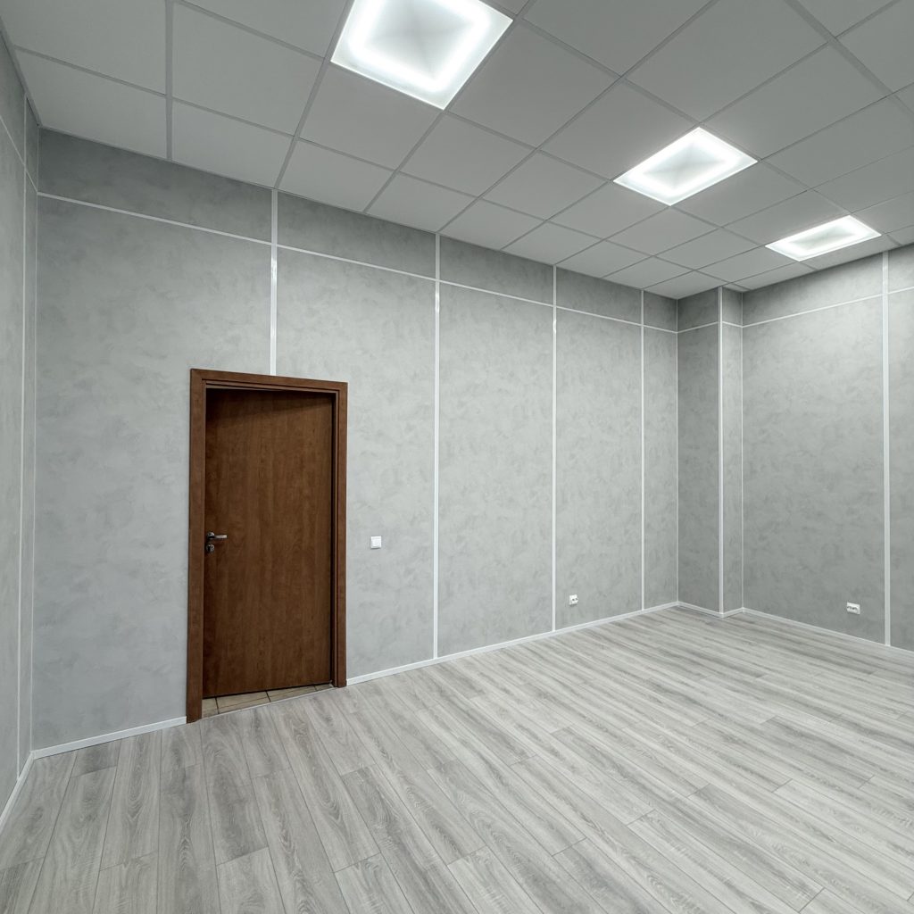 Описание помещения: блок из двух офисов: оф.402 — 50,08 м.кв. и оф.404 — 33,93 м.кв., со свежим ремонтом в светлых серых тонах. Вид из окон — во внутренний двор.